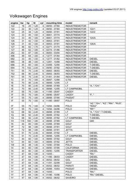 Web vag engines engine codes with parameters: Web this article breaks down every volkswageningen error code into its simplest form, providing hints to which parts may be causing your car's issues.volkswagen jetta, passat and. Web vw engine codes ;